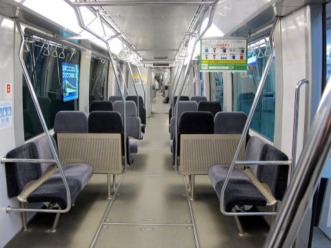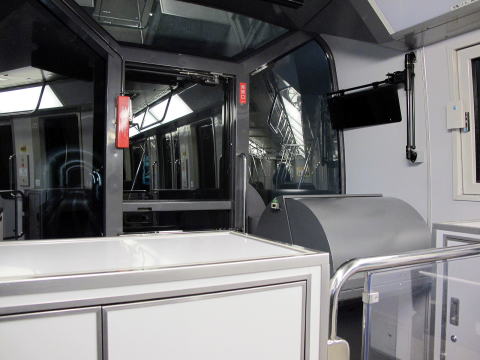 一番前に陣取る。完全自動運転なので乗務員はいない。右側には有人運転用の機器が設置されている