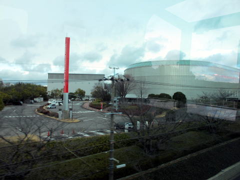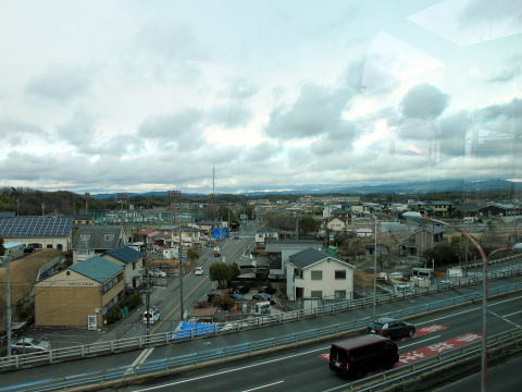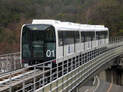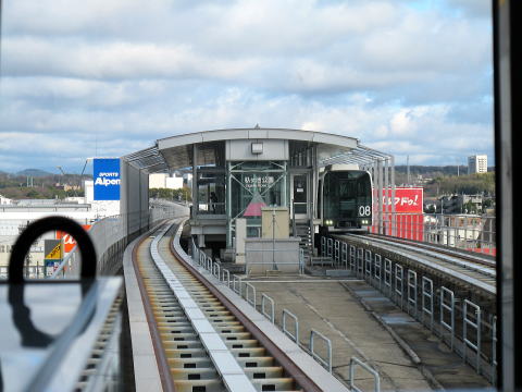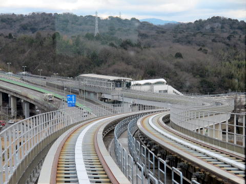 向こうの山に見えるのは残雪か?軌道法で運営されているが、モノレールと同様にほぼ全線が高架区間なので周囲の眺めは良い。周辺は丘陵地帯で相応に緑も多いが、低層の住宅地が多く鉄道路線としては需要に恵まれていると思う。しかしながら、中京圏は名古屋の都心部を除いて自動車社会なので、この辺の人たちも殆どの所用を自動車使用でこなすのであろう・・・・・・