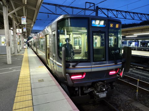 これも米原止め回送入庫。クモハ223-2043。幕は回転中で�L快速になっている。アルファベットはJR西日本が独自に採用している路線記号でAは北陸線、琵琶湖線、京都線、神戸線などいわゆる新快速が通し運転されている路線、Bは湖西線、Cは草津線と設定されている。種別にアルファベットでどこに走っていくかわかるようにする、というものだが、アルファベットが何線を表しているか知らないと意味はない。まぁ、普段利用していて、Aのに乗れば帰れるよ、とか覚えておけばいいのだろうけど