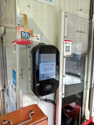この黒いリーダー。ディスプレイに表示されている通り、クレジットカードのタッチ決済用リーダーなのだ。ハイテクだ!!VISA、JCB、アメックスが使えるらしい。関東の大手私鉄ですらまだ試験的に導入が始まったばかりなのに、もうここでは利用可能なのだ。ちょっとステッカーが見えるけど、ペイペイ払いも出来る。交通系ICカードよりもランニングコスト少ない上に、今やほとんどの人がスマホを持っているので実効力は高いのだろうな
