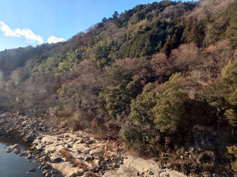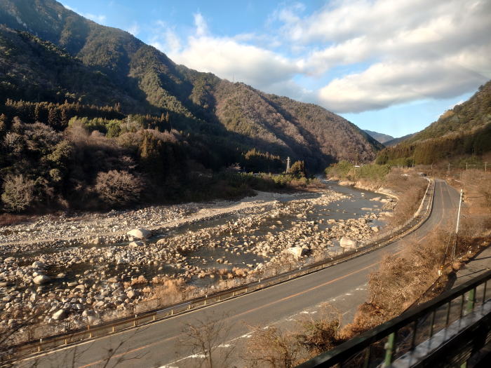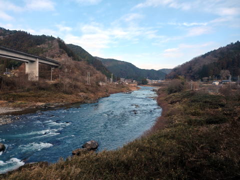 まだ川幅が広い。ごろごろとした石がたくさん転がっている。木曽川は大正時代からダム建設が盛んに行われており、電源開発による日本の近代化に多大な貢献を果たしてきた。急峻な山間部を流れ落ちている割にこうして浅い河が広がっているのは本流に多数のダムが建設されて計画的に流量が調整されているからである