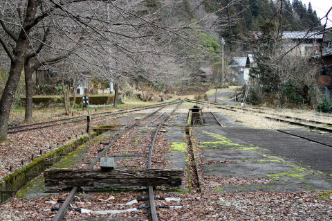 先にあるのは転車台で、ここで転回して頭を美濃太田方に向け直したら客車や貨車の先頭に入換、連結していたわけだ。機関車を使用するような列車は皆無になったが、書類上は現役設備とのこと。かつては岐阜駅に設置されていたもので、先の第五長良川橋梁のメーカーと同じ、アメリカンブリッジ社が1902年に建造したもの。越美南線が当駅まで開業した1934年に移築されており、蒸気機関車が現役だった1960年代まで使用されていた。貨物輸送は1970年代まで残ったが、こんな盲腸線の割に需要が旺盛だったので比較的早くに無煙化されており転車台を使用する機会は1960年代以降激減したという。この転車台は大井川鐡道の千頭駅にある1897年製のものに次いで日本で2番目に古いものだそうだ