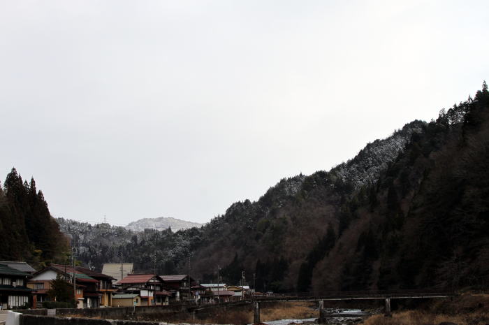 駅前道路から来た、ひるがの方面を望む。奥の山は雪景色だ
